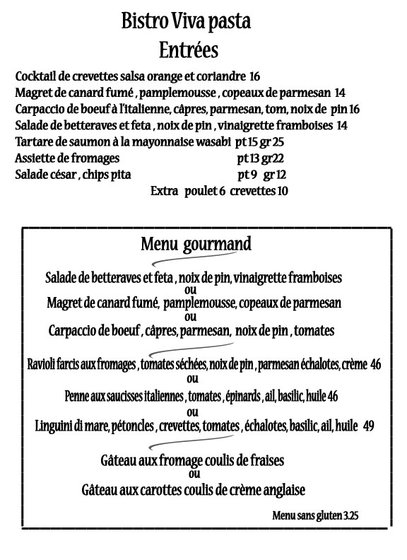 Menu soir et take -out Nos heures d’ouverture Du mercredi au samedi dès 17h Réservation 450 346 4800 www.bistrovivapasta.com