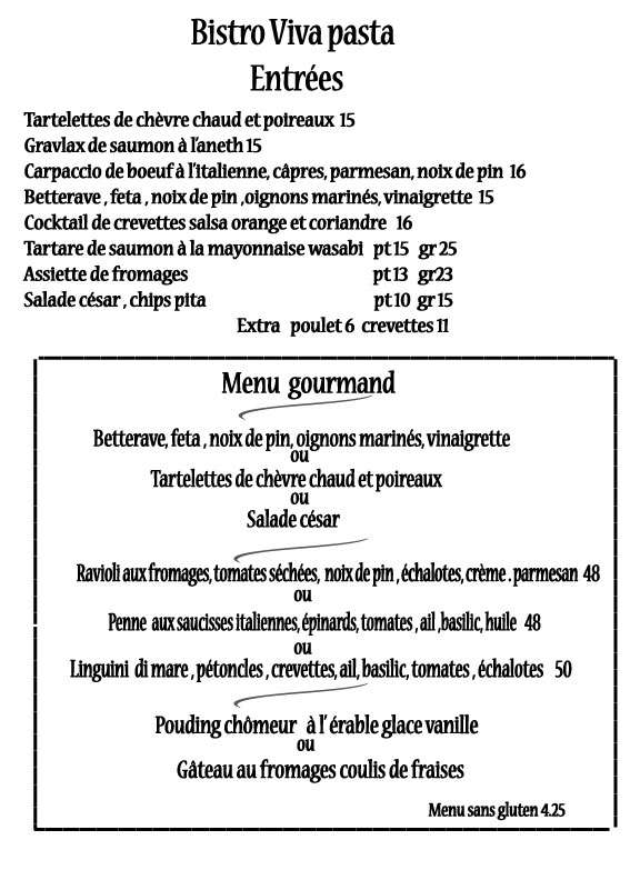 Menu soir et take -out Nos heures d’ouverture Du mercredi au samedi dès 17h Réservation 450 346 4800 www.bistrovivapasta.com